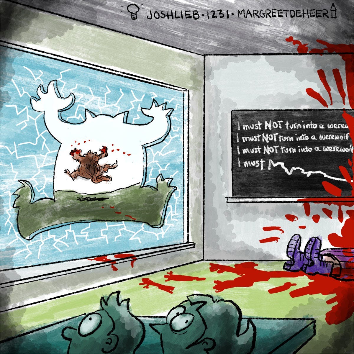 What can I say? This is great. The werewolf silhouette in the glass is an especially masterful touch. I’ll note that all the gruesome stuff — dead teacher, BLOOD — is from Margreet’s vivid imagination, and was never in my original description at all. Margreet, you terrify me (with your talent). Thank you.